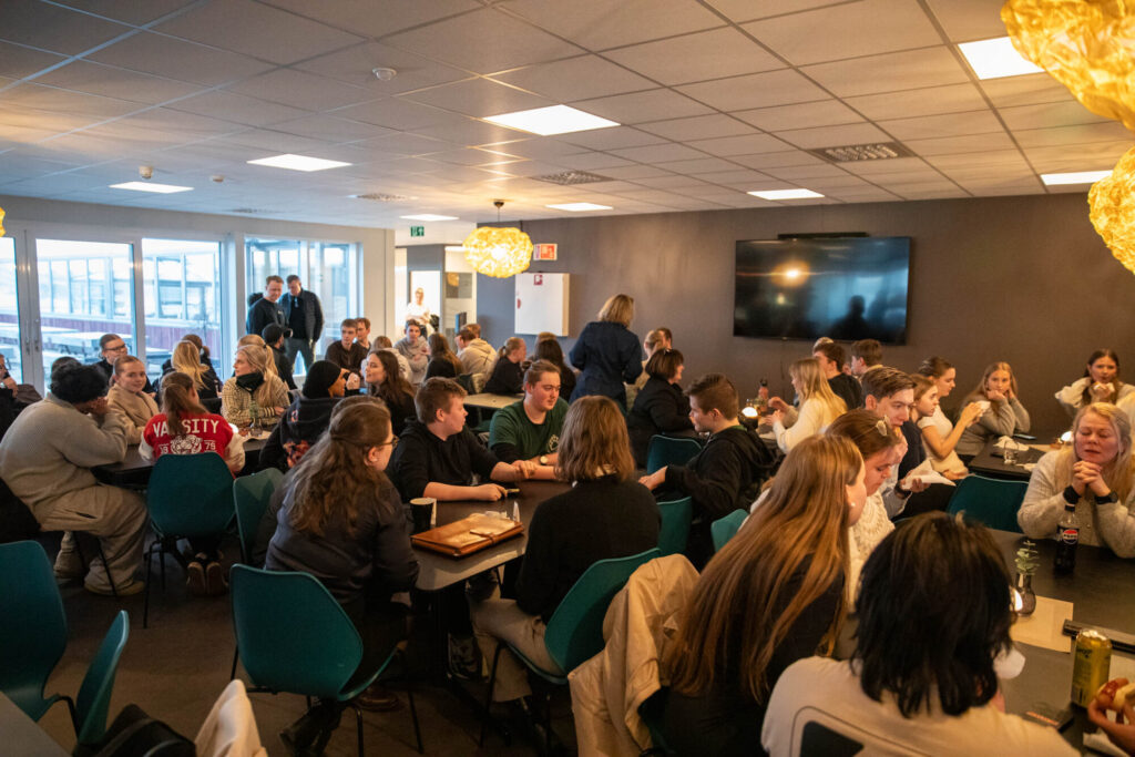 Bedriftene får også fire minutter hver til å synliggjøre framtidige behov, før dialogen fortsetter rundt bordene i kantina. Her diskuteres utdanningsvalg, jobbmuligheter og erfaringer på en uformell og lavterskel måte.